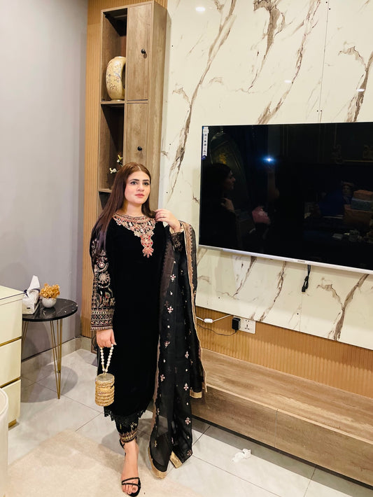 JAZMIN -3PC HEAVY EMBROIDERED VELVET DRESS WITH 4 SIDE EMBROIDERED ORGANZA DUPATTA- FPW-85