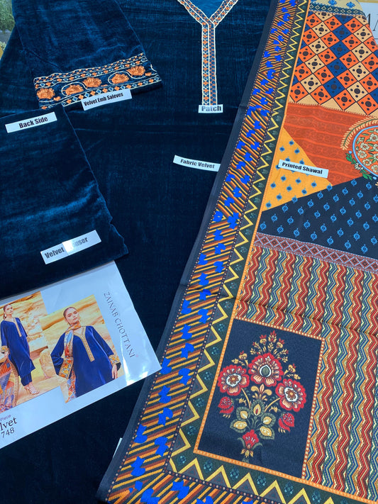 AZURE -3PC FANCY EMBROIDERED VELVET DRESS WITH HEAVY EMBROIDERED VELVET SHAWL- FPW-62