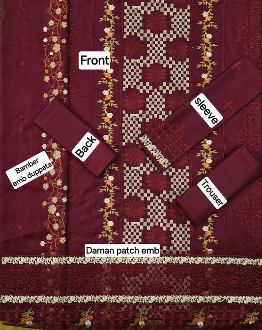 CRIMSON -3PC EMBROIDERED DHANAK DRESS WITH EMBRIDERED DHANAK SHAWL- FW-77