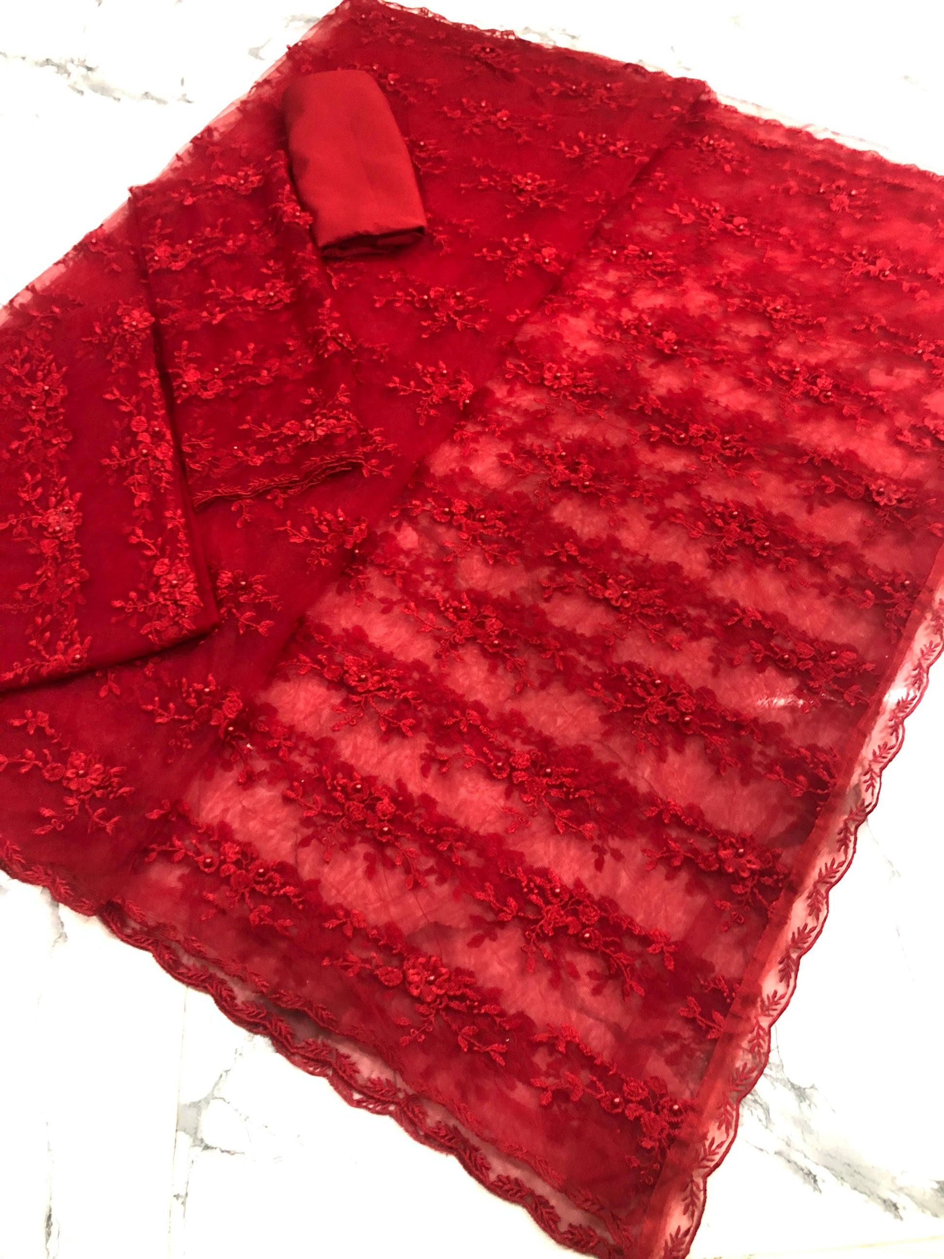 Saree made on imported Net with Thread Embroidery with 3D flowers attached with punch Balls
